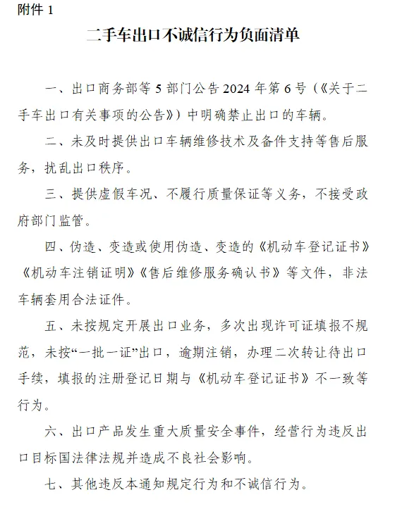 (三)建立企业动态管理及退出机制。各地商务主管部门要加强本地二手车出口信用评价体系建设,对照《二手车出口不诚信行为负面清单》(附件1),对企业开展日常监督与动态管理,规范企业经营行为及出口竞争秩序。要及时对有不诚信行为的企业进行约谈,对有多次不诚信行为、未及时提供出口车辆维修技术及备件支持、不履行质量保证义务的企业,或者此类企业法人及关联人另设企业开展二手车出口业务的,应责令其就此前不诚信行为制定并落实整改措施。在受理审查其出口许可证申请时,应综合考虑整改落实情况作出是否准予许可的决定。