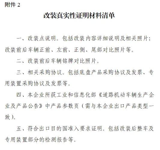 (四)严格以改装车名义出口车辆的许可证申领条件。各地商务主管部门要指导改装车出口企业准确填写车辆底盘品牌、改装车品牌、车辆型号等信息,提交改装真实性证明材料(附件2)。对无法证明改装真实性,同类改装车产品未列入工业和信息化部《道路机动车辆生产企业及产品公告》、不具备有效的国家强制性产品认证的产品,不予发放出口许可证。要对本地改装车生产企业出口情况、与出口量相适应的改装生产能力等进行排查,相关情况及时上报商务部。商务部、工业和信息化部、海关总署将密切监测并及时共享改装车出口各环节异常情况,加大检查及惩处力度。